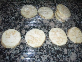 También las pelo y corto a ruedas gorditas, las pongo sobre un film, las tapo con el mismo y cierro bien los bordes, separadas una a una, en paquetes de 4, luego vuelvo dos de un lado y dos de otro, quedando el montoncito hecho, sin que se puedan pegar