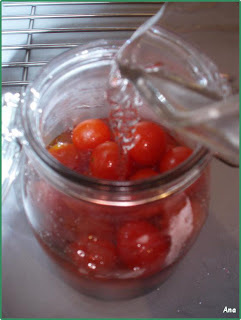 4.- CUBRIREMOS LOS TOMATES CON PARTE DE ELLA ( sólo hasta cubrirlos pero el resto no la tiramos, dejamos que se enfríe porque nos servirá para rellenar el tarro )