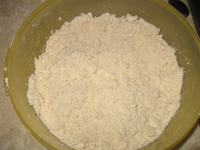 Luego, le vas echando poco a poco, el aceite y revuelves muy bien, a que te quede como arenita la consistencia de la masa. (Puedes revolver con la cuchara o con la mano, yo uso la mano).