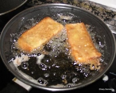 Inmediatamente se pasa cada pieza por los huevos batidos y se fríe bien por los dos lados.