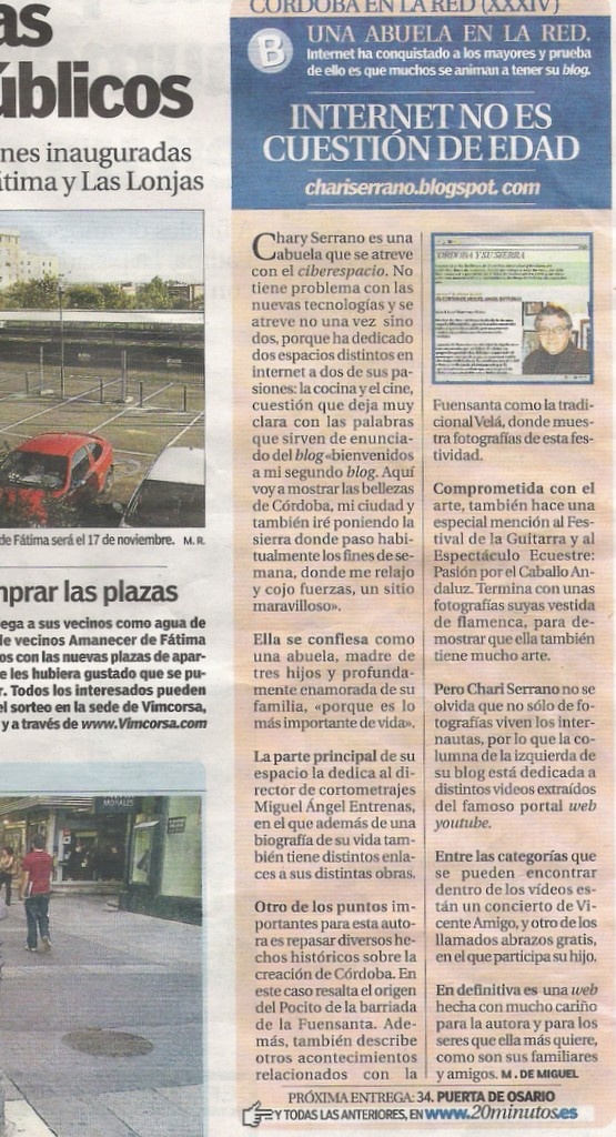 El pasado dia 6 me llevé una grata sorpresa cuando vi que en el periódico 20minutos hablaban de mi afición bloguera y ponían foto del reportaje que entonces iba en primer lugar, de mi blog de Córdoba .
