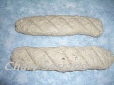 La tuve levando más de 3 horas, para que quedara bien esponjosa, la saqué y la bajé, amasándola con las manos llenas de aceite y con algo más de harina, hasta formar dos barras, a las que hice unos cortes en diagonal