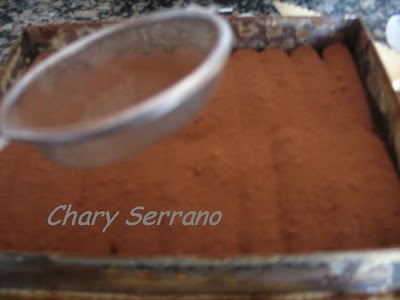 Ayudándome con un colador, reparto el cacao de forma uniforme sobre el tiramisú.