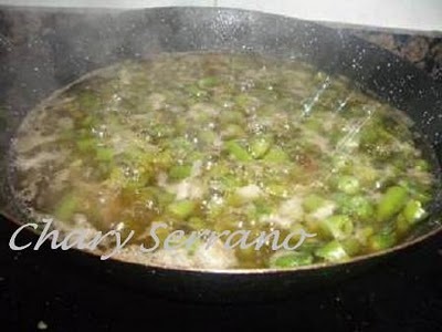 Se echan a freír primero las cebollas con sal en aceite abundante y en unos minutos se incorporan las habas y se va friendo.