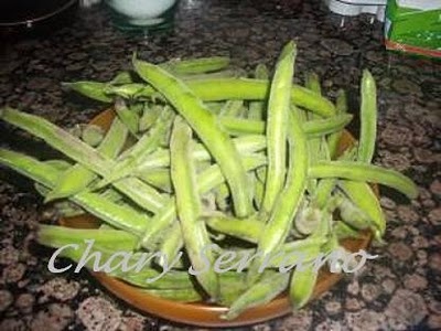 Se les quitan a las habitas los dos extremos y se parten a trocitos. Las que son algo más grandes se desgranan, para que algunas se vean enteras.