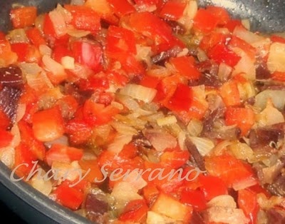 Mientras tanto cortamos el jamón a laminitas y el chorizo a trozos finos y pequeños, revolvemos con el sofrito y reservamos.