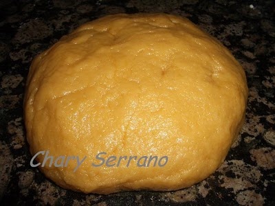 Con una cuchara de madera vamos mezclándola con la harina y añadimos el aceite del sofrito, el pimentón y la sal. Ligamos todo y la pasamos a la encimera en la que habremos espolvoreado harina y amasamos, incorporando el resto de la harina hasta que quede una masa lisa.