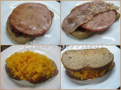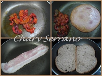 Calentamos las rebanadas de pan en una sartén, para que quede una poquita de costra que las hará mas fuertes y ponemos sobre una de ellas el pimiento, encima el pavo, la loncha de bacon, todo caliente y cubrimos todo de huevo hilado.