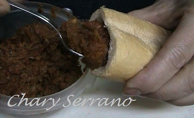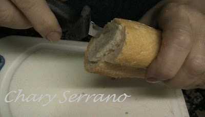 Después saqué un trozo de baguette del día anterior y la vacié completamente, dejando en el centro un buen hueco. Me ayudé con un cuchillo corto y un saca bolas.