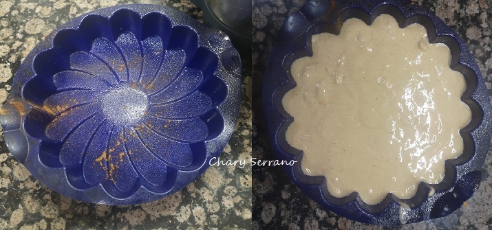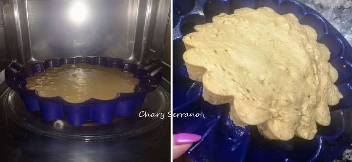 Lo ponemos en un molde de silicona ligeramente espolvoreado con canela molida y lo metemos en el microondas. Tened en cuenta que el microondas no da bonito color y la canela se lo aporta, aparte de un buen sabor.