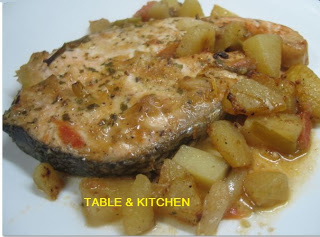 AQUÍMe puse manos a la obra con algo sencillito. Una rodaja de salmón y unas patatitas hechas previamente en el microondas y terminadas en la sartén, con unas especias.