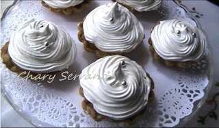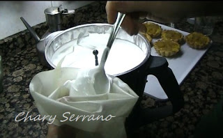 las rellenamos con 2 cucharadas de crema en cada una, otras dos cucharadas de trocitos de manzana caramelizada y por último ponemos en la manga pastelera una boquilla rizada del 8 y el merengue y vamos cubriendo las tartaletas con el merengue.