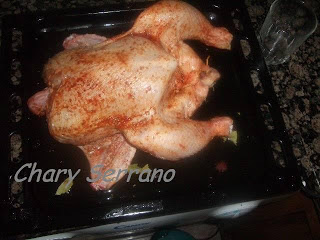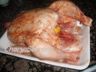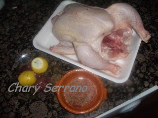 Con esa mezcla se unta muy bien el pollo por dentro y por fuera,  se meten los higaditos limpios y se acomodan las 2 mitades del limón en el interior (el objetivo de cortarlo es que el limón tapone todo el conducto). Se cierra con unos palillos.