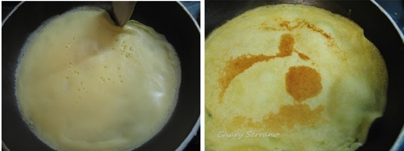 Cuando la masa esté a nuestro gusto, echamos una porción suficiente para poder extenderla por toda la sartén y que nos quede fina.