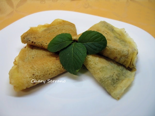 Cerramos las creps doblándolas sobre si mismas y las volvemos a doblar. Así quedan cómodas de comer y bonitas. Las adorné con unas hojitas de menta. Se sirven recién hechas.