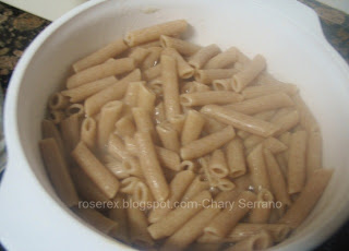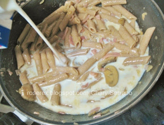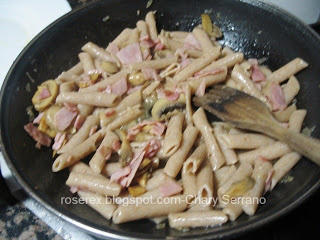 Cuando los macarrones estén al dente los colamos y pasamos a la sartén, mezclandolos a fuego vivo.