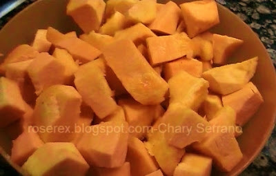 Comenzamos cortando la calabaza, quitándole piel y semillas y la troceamos. (He usado una variedad de las que tengo en el huerto, la que se conoce como "avellana" o "violín". Es de carne naranja intenso y bastante dulce).