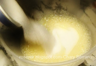Batimos con las varillas eléctricas los huevos y cuando doblen su volumen incorporamos la fructosa o el azúcar y seguimos batiendo hasta que blanqueen.
