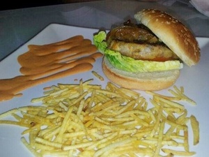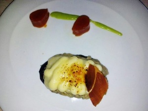 Tapa: Rossini de Berenjenas gratinado sobre crujiente de ibérico - Restaurante Araceli marisqueria.