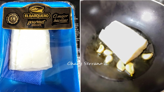 Ponemos en una sartén el Aove y los dientes de ajo pelados y cortados por la mitad a lo largo. Justo cuando empiecen a dorarse ponemos el bacalao en la sartén con la piel para arriba. Lo tenemos así unos 2 minutos y le damos la vuelta.