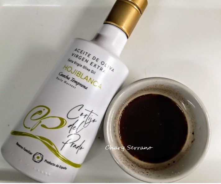 Para esta preparación he escogido un gran aove cordobés, de la variedad hojiblanca y de cosecha temprana: Cortijo del Prado, con un aroma frutado verde, de amargor medio y picor medio-alto. Recogidas las aceitunas en una finca de Montalbán de la que se tienen referencias a finales del siglo XVIII en el Archivo Ducal de Medinaceli, donde se reseñan las propiedades y derechos del Duque como marqués de Comares.