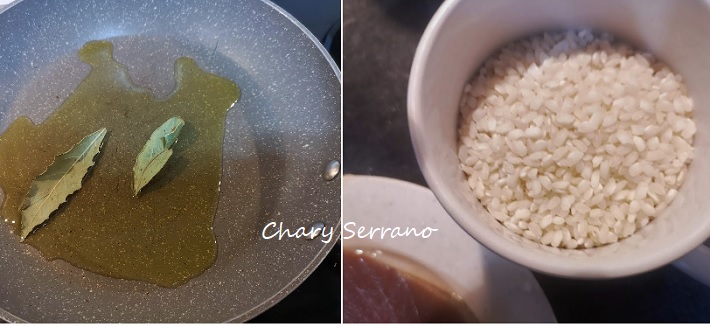 Ponemos las 3 cucharadas del aceite de oliva virgen extra en una sartén con 2 hojas de laurel. Las freímos ligeramente para que dejen máas sabor. Medimos el arroz.