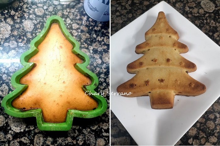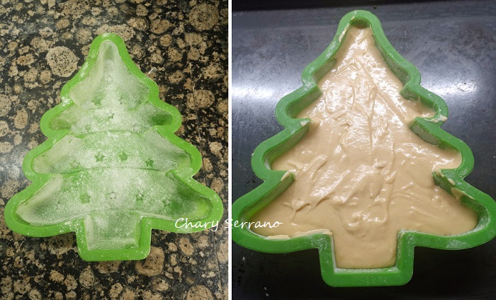Ya tenemos nuestra mezcla hecha. La distribuimos por el molde y aplanamos con la espátula. Damos varios golpes en la encimera para que llegue a todos los huecos. En este caso es importante insistir, para que en el molde queden bien rellenos los huecos que después adornarán el abeto.
