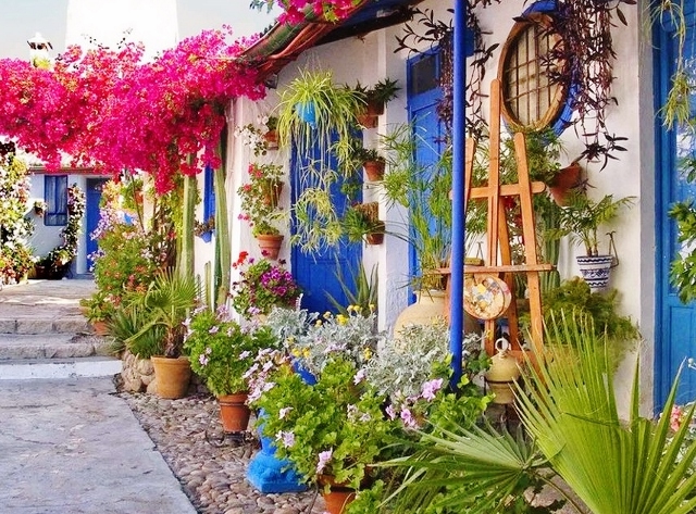 Será, entonces, cuando comenzaremos a percibir su belleza: la blancura de las paredes, que nunca es perfecta y que mantienen todavía la huella de las manos que las encalaron; el pozo como manantial silencioso de vida, en el centro de la estancia, porque la vida es lo más importante, lo que hay que mantener siempre; las macetas innumerables y asimétricas, esparcidas por todas partes como si hubieran brotado de la tierra o hubieran descendido lentamente del tejado, en una lluvia de plantas, inesperada; las flores, cuántas y de todas clases, con sus aromas diferenciados, que están allí para saludarnos, no sólo con su presencia, sino con su belleza multicolor; el limonero, que ofrece su color y su fruto.