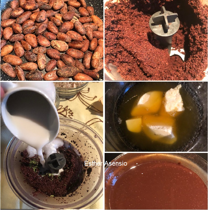 Ahora vamos a triturar las semillas peladas de cacao, durante unos minutos. Cuanto más se vayan pulverizando los granos de cacao, notaremos que se va apelmazando formando como terrones, eso lo hace la grasa que va soltando, hasta conseguir la consistencia que deseamos.