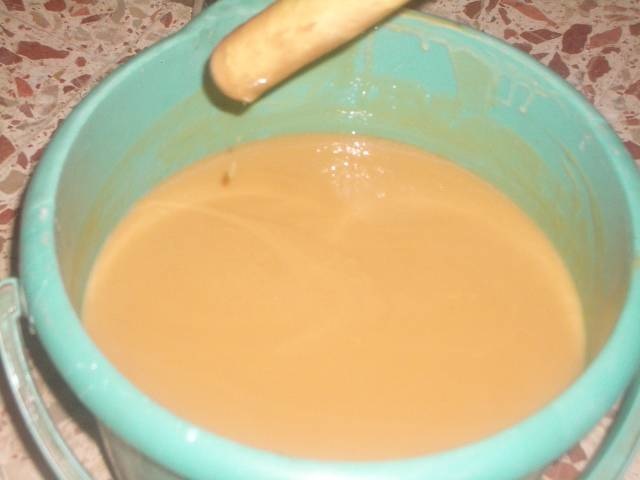 Cuando la mezcla está mucho mas clara y espesa se saca el palo y se ve si cae gota a gota o a chorrito. Tiene que caer a gota, pero no seguida, que casi se quede en el palo.